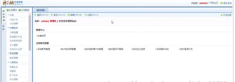 7、后台的“淘宝客、星座每日运势、黄道吉日、历史今天、生日密码”,这几个功能在后台只是框架,前台暂时没有对应功能,还在开发中,所以会出现后台打不开的情况(介意勿拍)